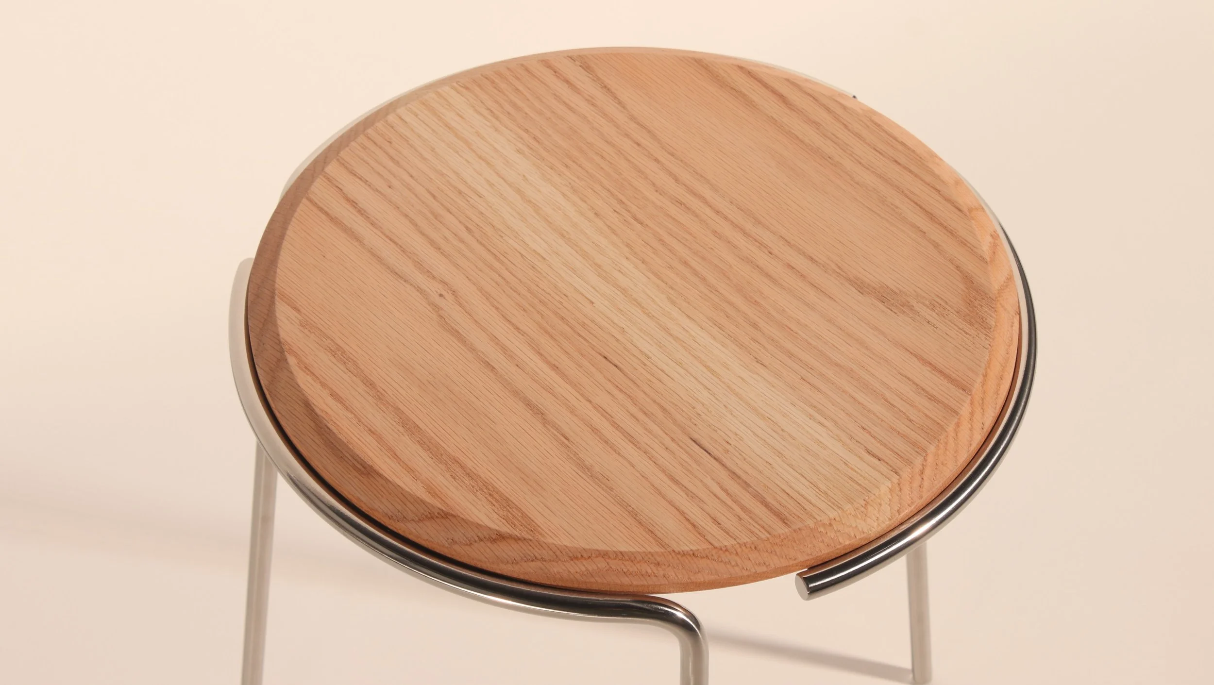 The solid oak top appears to float, because of the careful positioning of three stainless steel rods that wrap around the edge. The legs, bent at an 80° angle, give a kind of walking rhythm when viewed from different angles.